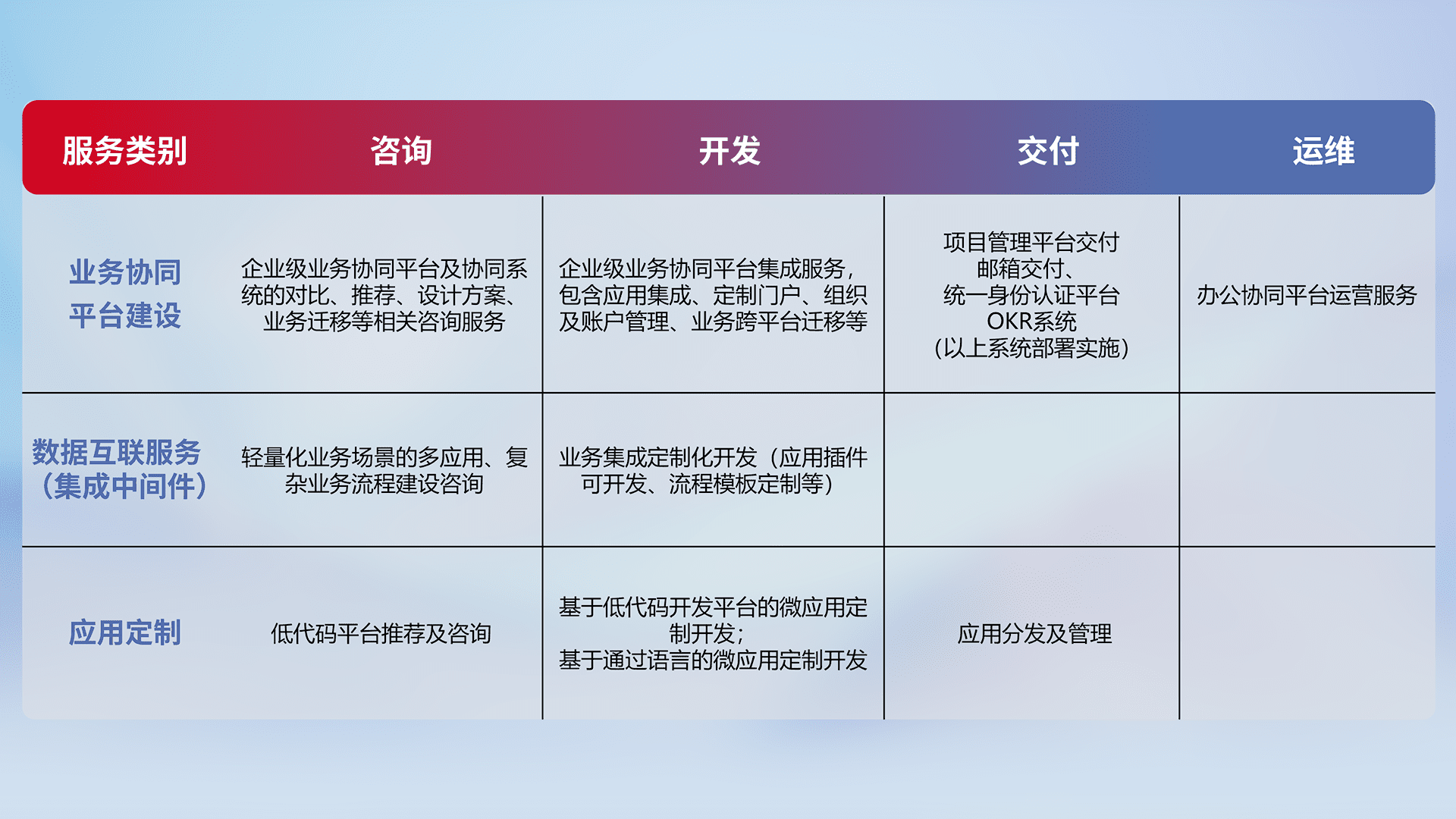 针对钉钉、、、、企微、、、、IDaas等平台级产品提供产品的规划、、、、方案、、、、交付、、、定制化开发等服务,,,,实现如统一协同办公、、、智能客户服务、、、混合会议管理、、、、智能数据查询、、、、等业务场景,,,,实现数字化转型。。